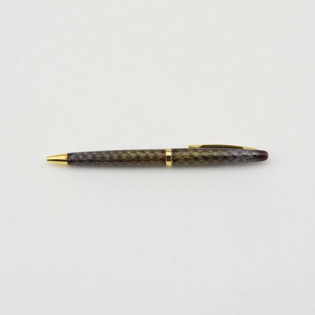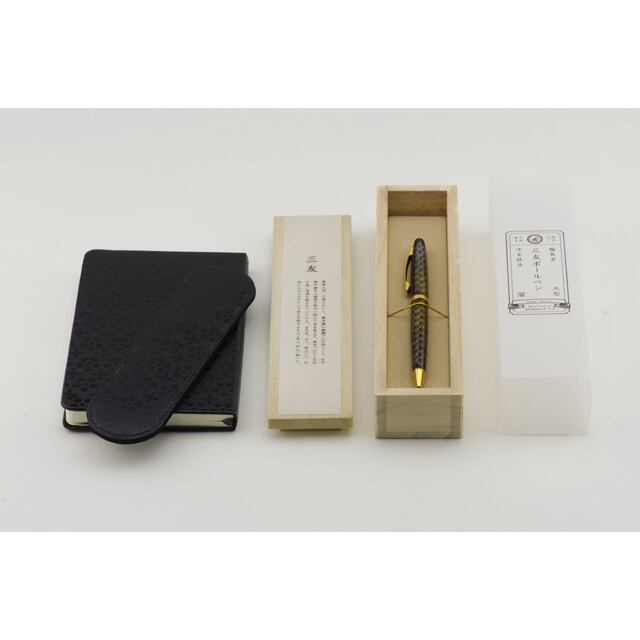 石川県輪島市で平安時代にも及ぶ長い歴史を持つ老舗「輪島塗」。その中で培われてきた、伝統工芸の沈金技法で松の模様を彫って金を入れて描いているボールペンです。輪島の職人が、ひとつひとつ丁寧に彫っています。付属品にモレスキンのノートに梅と竹の文様を印伝技法でほどこしたセット商品です。